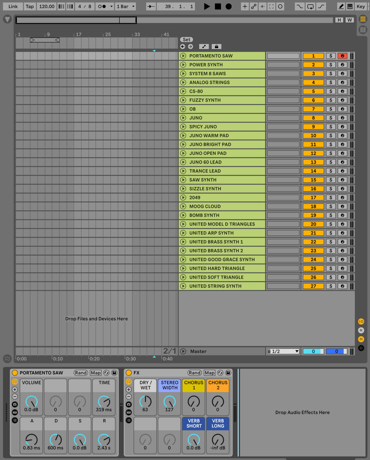A curated set of 27 synth patches sampled from classic analog and digital gear — including Juno, Prophet, Oberheim, and Moog-inspired sounds. Fully mapped for Ableton Live, no extra plugins required.This does use an Ableton FX Rack I made that uses the "TAL-CHORUS-LX" plugin.