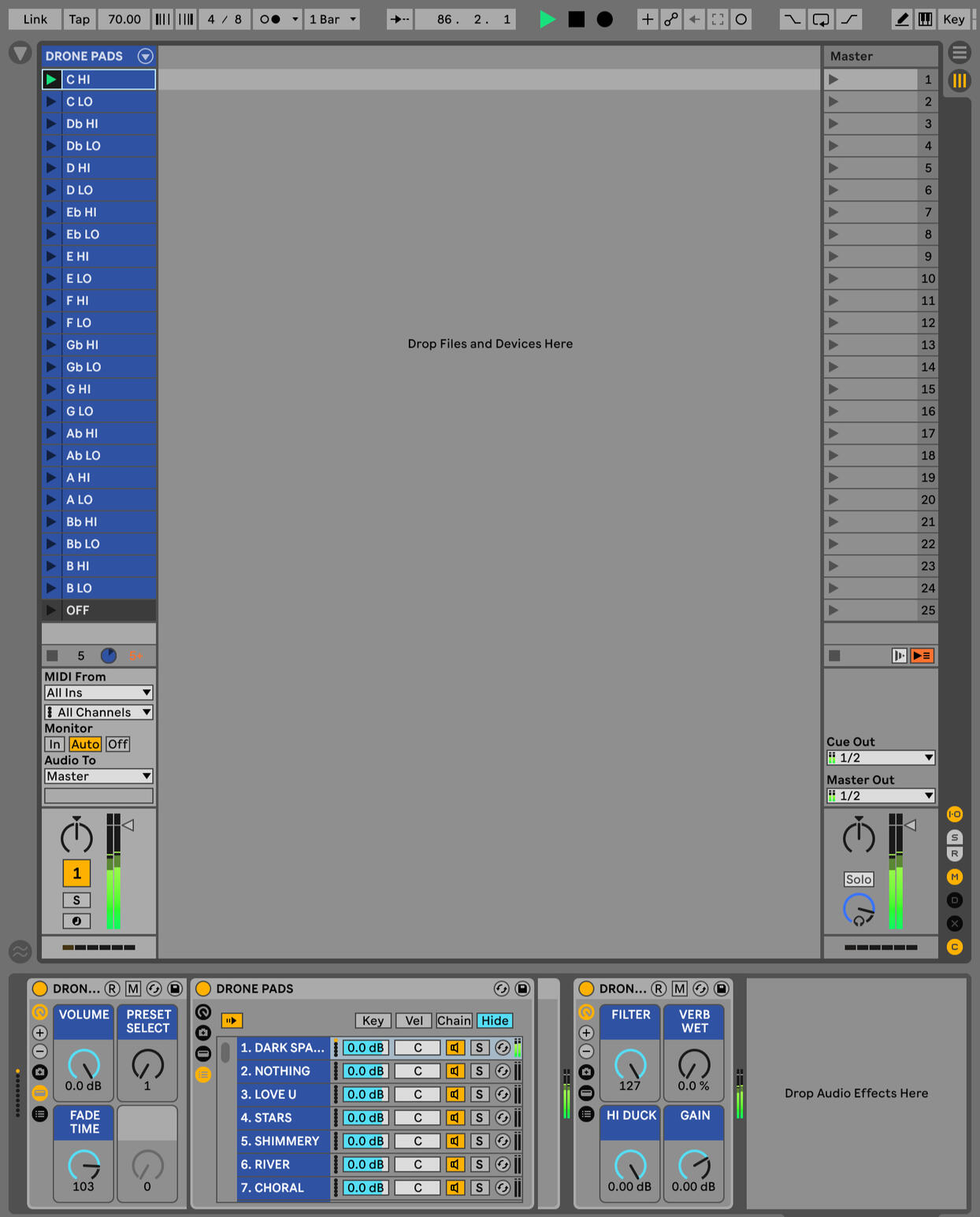 Drone Pads is a collection of warm, dark, and shimmering soundscapes designed to add slow-moving depth and texture to your sound.Each of the 30 drone pads is playable in every key, making them perfect for creating smooth transitions between songs, keys, or moments in a live set.Every sound comes pre-loaded in a fully mapped Ableton Rack with intuitive macro controls, plus a custom FX rack to shape and expand your drones even further.